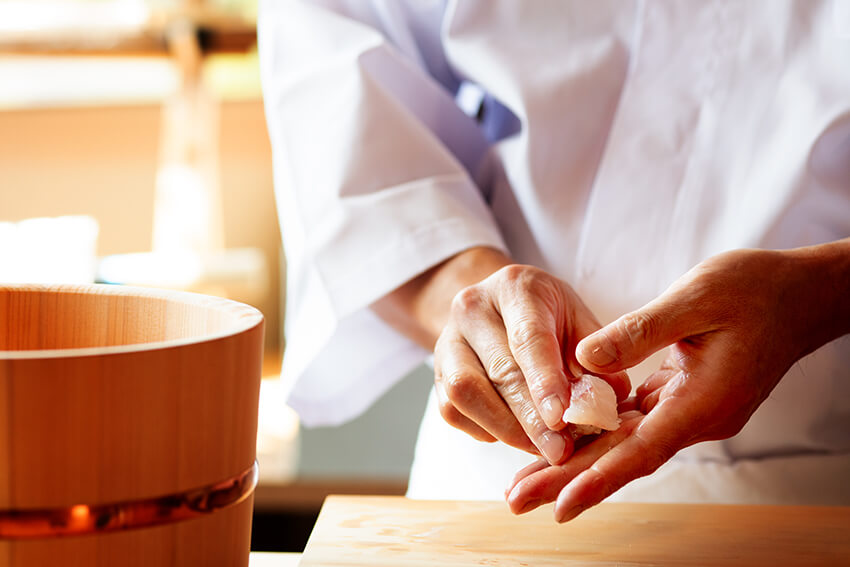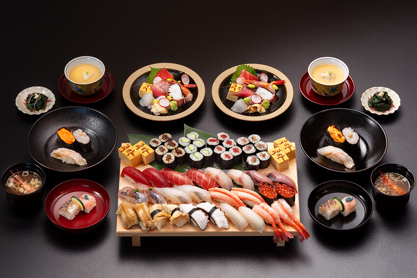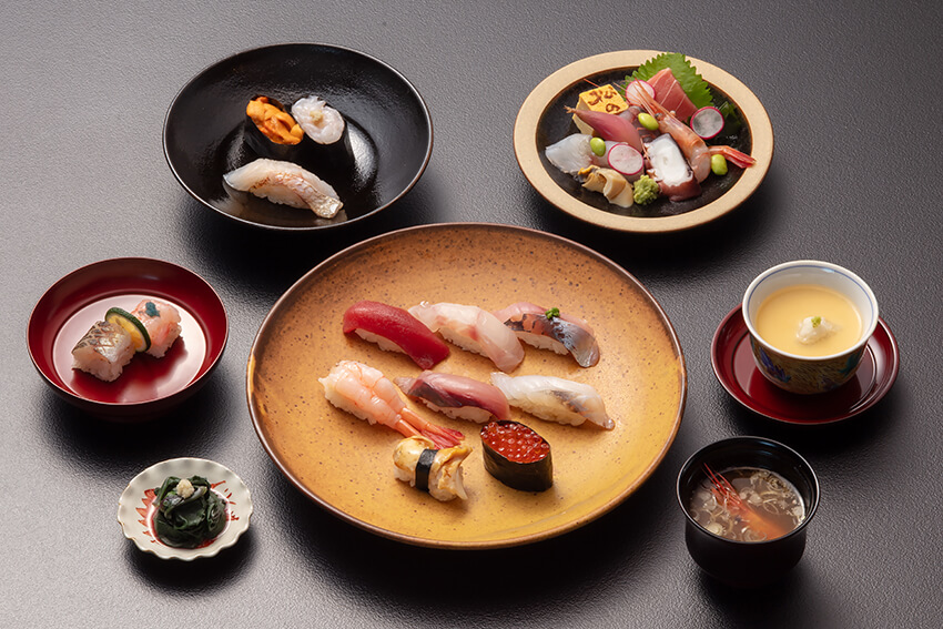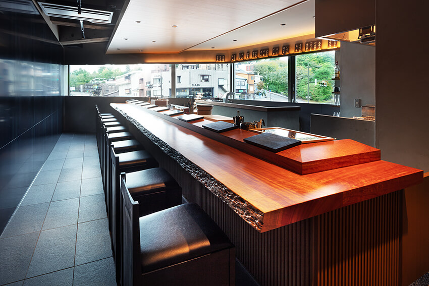 7mを超える一枚板のカウンターを設えた四季折々を感じる空間で、日本三名園の兼六園を眺めながら、 北陸の魚を中心に、職人の手仕事が効いた本格的な鮨と銘酒を味わえる店です。